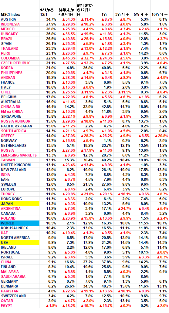 世界の株価指数総上昇のような気がするが、MSCI先進国+新興国指数で、ドルベース、12月1日までの過去3か月で、下がったのはエジプトだけ。